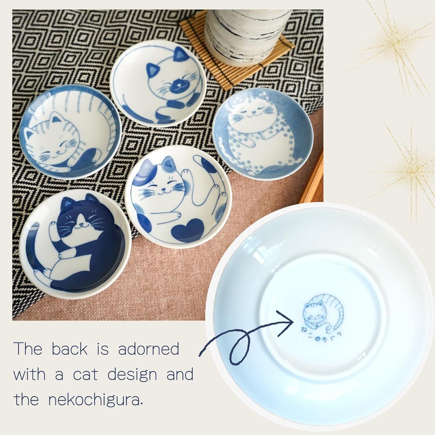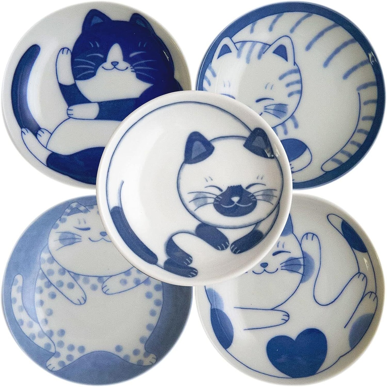 LOVE LOVE JAPAN Dessert Sushi Soy Sauce Salad Small Plate Set Ceramic Cats Design Set of 5 Made In Japan Sleeping Cat